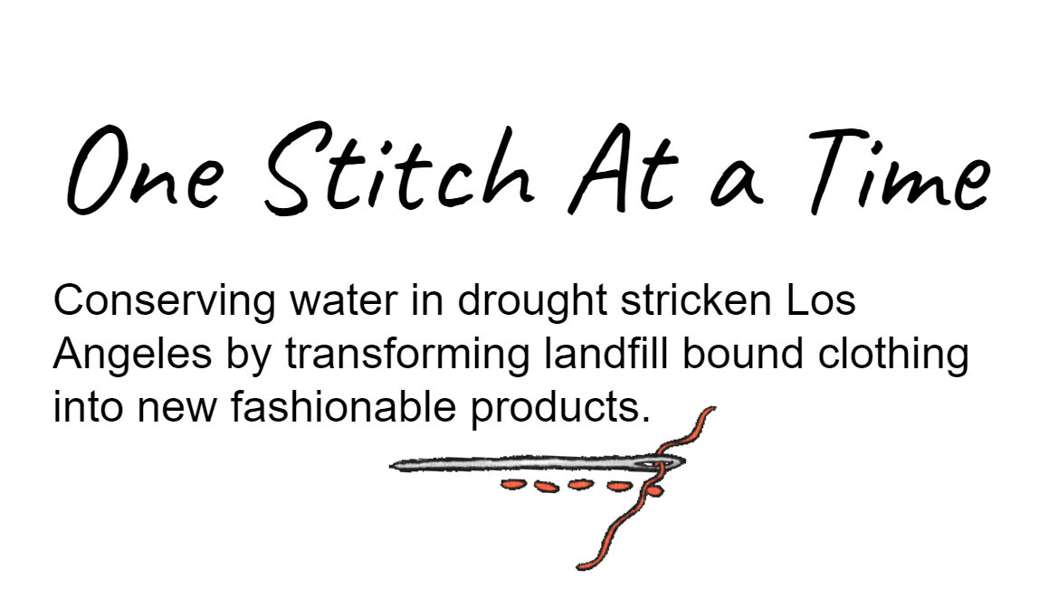 One Stitch at a Time is a project focused on upcycling clothing into new items that can be worn or used with a new purpose. For example, it can take up to 2,800 gallons of water to make a pair of jeans and 713 gallons for a cotton shirt. In the US, 66% of all unwanted clothes and textiles end up in the landfill. Less than 15% are recycled. The textile production process contributes to about 20% of global water waste. One Stitch at a Time’s goal is to take used clothing and textiles and repurpose them into something new that can be worn or used. It demonstrates samples that could be scaled up in large quantities like quilts, pillows and hand bags. Los Angeles Textile industry is the largest in the United States. Reducing the amount of unsold clothing sent to landfills with not only help reduce waste but also reduce water consumption.